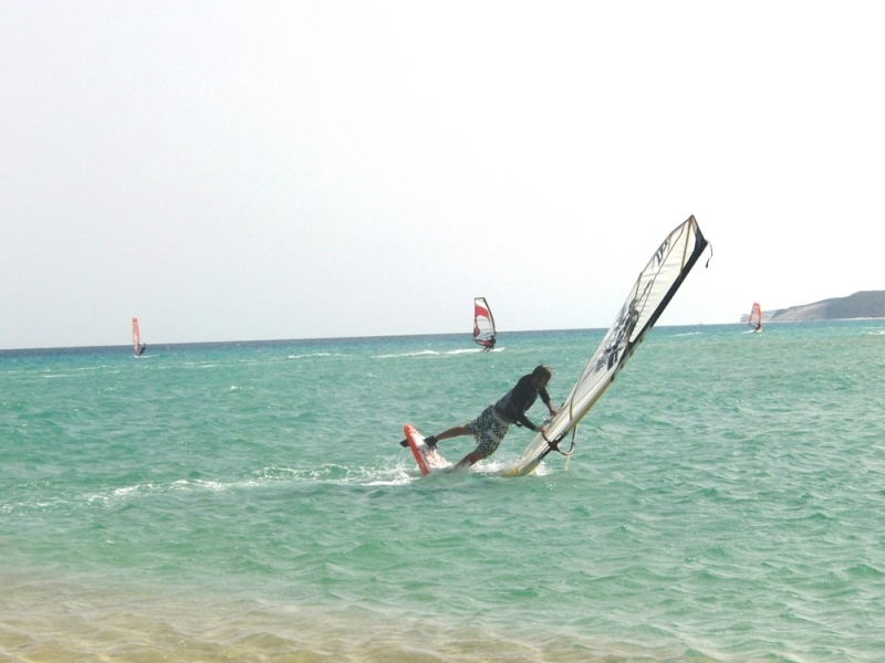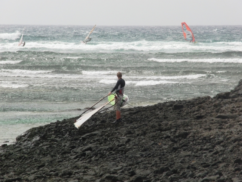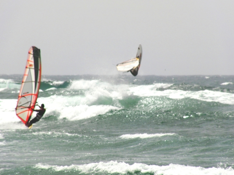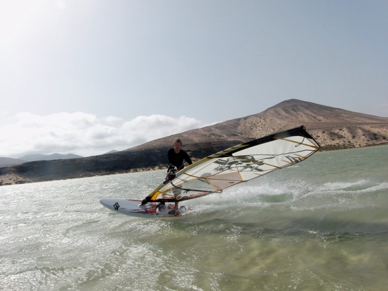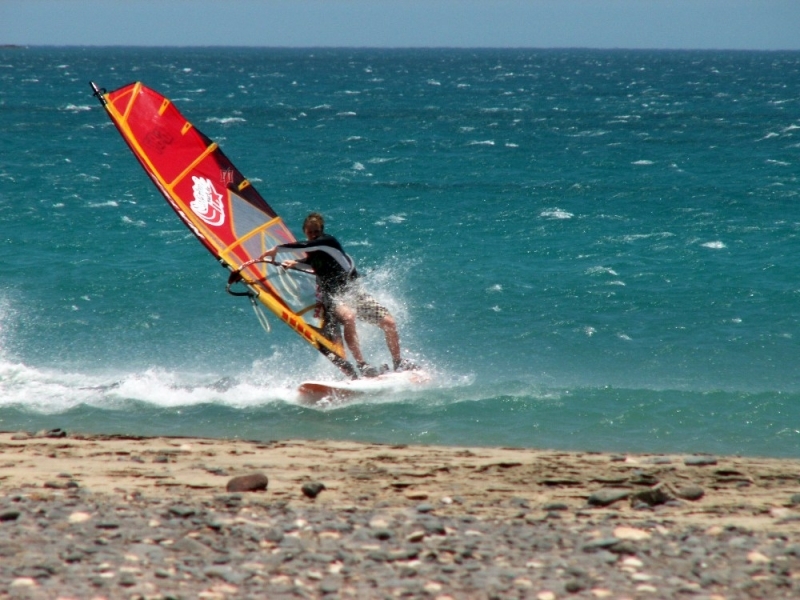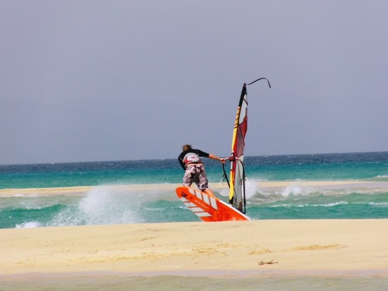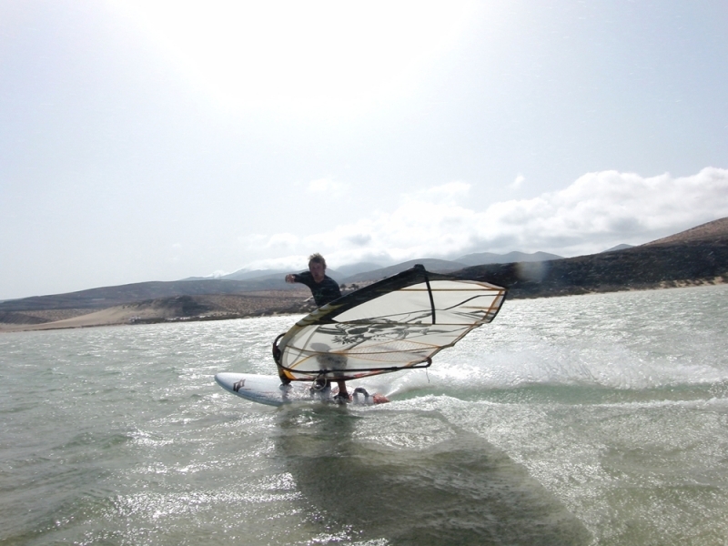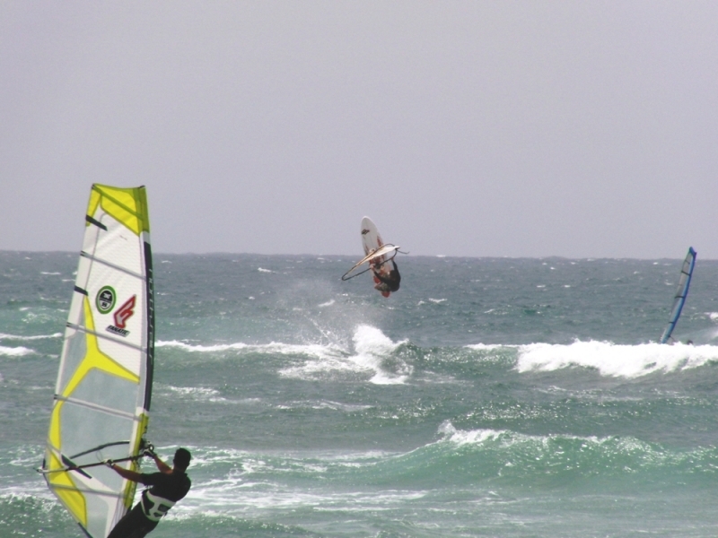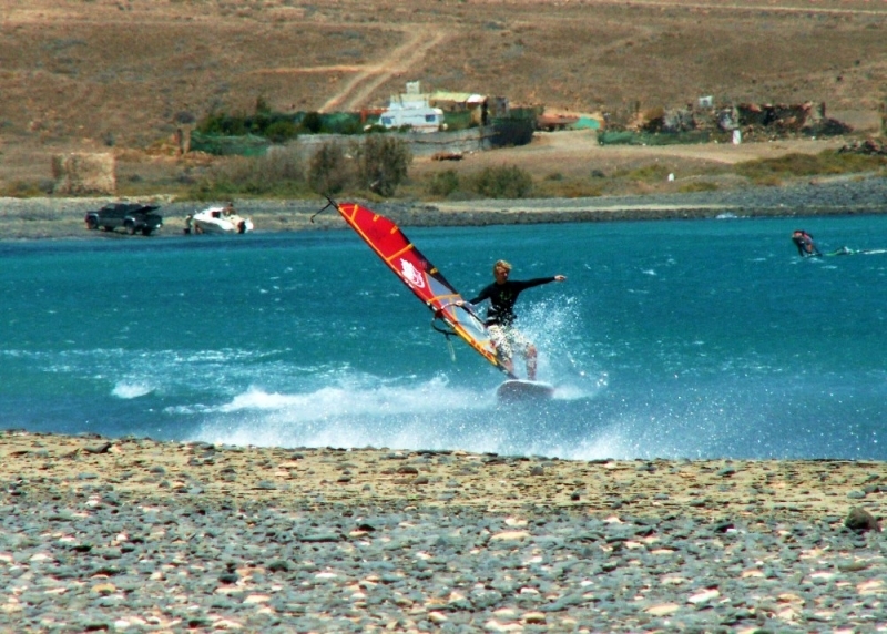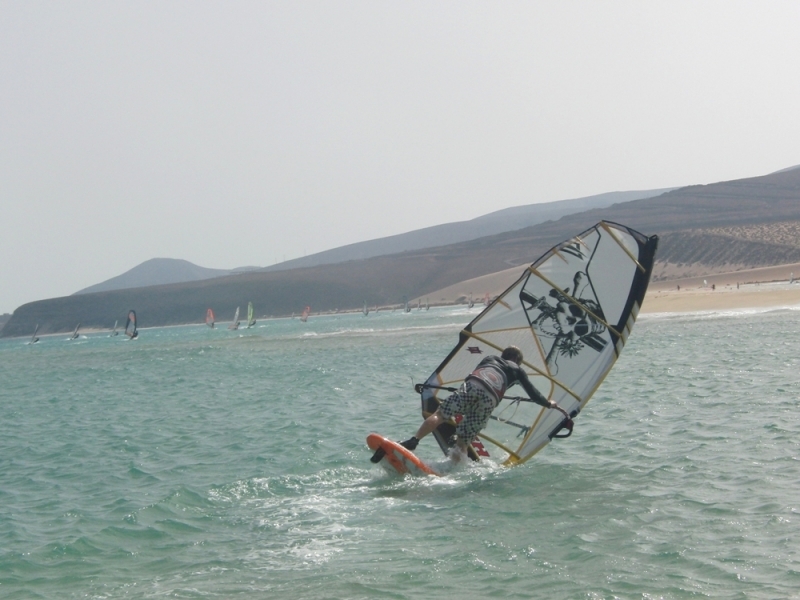 Windsurfing na Fuerte?? No jak bych to řekl,za celý měsíc nám nefoukalo asi třikrát.Jezdili jsme hodně na Sotavento což je hodina a čtvrt cesty . Na Sotáči jsou podmínky dost raketové,za celý pobyt jsem tam jen jednou vytáhl 5,0 a jednou nefoukalo vůbec,jinak pořád na 4,0 a 4,4 plachty (mám 80kg),většinou hodně ,hodně přeplachtíno. V těhlech podmínkách se nedalo nic moc extra naučit z frejstajlu ,natož pak něco fotit či točit(létajcí písek).Jezdili jsme u Rene Egli 2. Fouká tam víc a je tam hladší voda.V Rene Egli 1.je pořádný motocros a nás tam navíc čekal bombonek v podobě PWA ,super podívaná .co ty borci dokážou ,fakt nechápu.Jen občas jsme krapet nesouhlasili s rozhodčíma, Gollito sice vyhrál zaslouženě,ale nebyl zrovna sympatickej ,pro nás byl jednička Steven Van Brokenshit. Na jihu se také jezdí na pláži nad Costa Calmou ,super flat a vitr trochu slabší. Je fakt ,že takové bomby jako foukají na Sotáči jsem nikdy nezažil,ale je to super zážitek.
