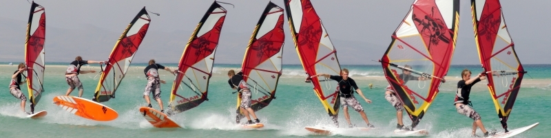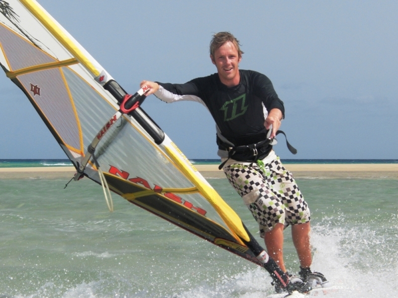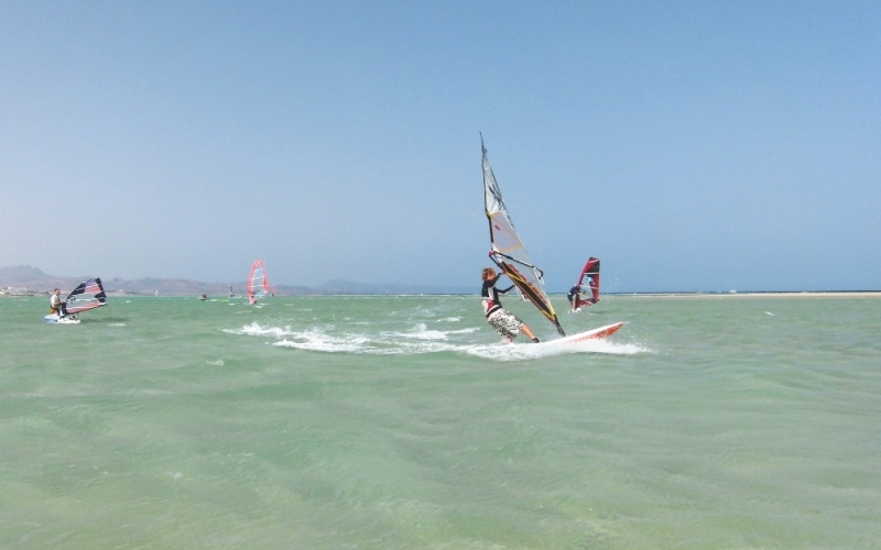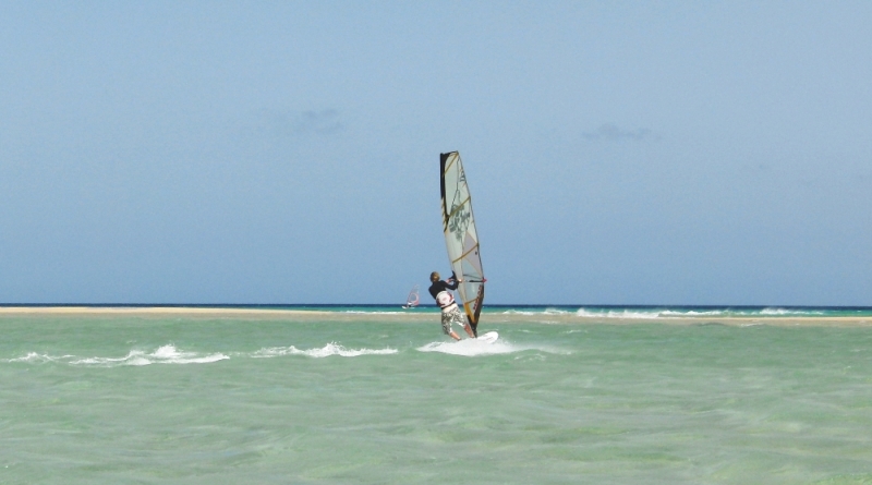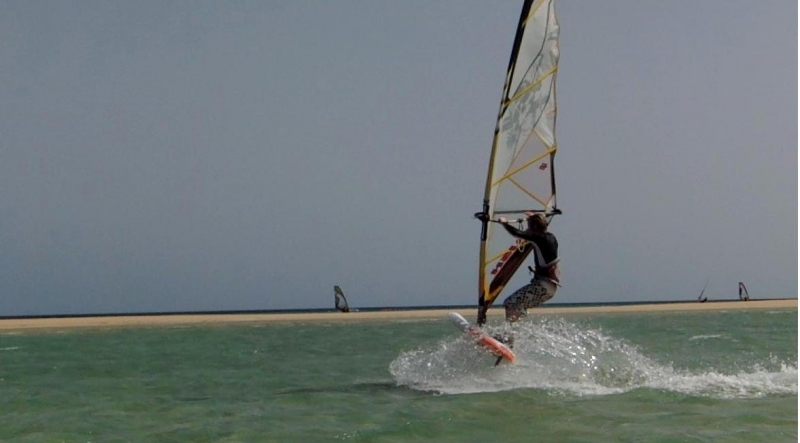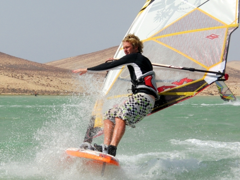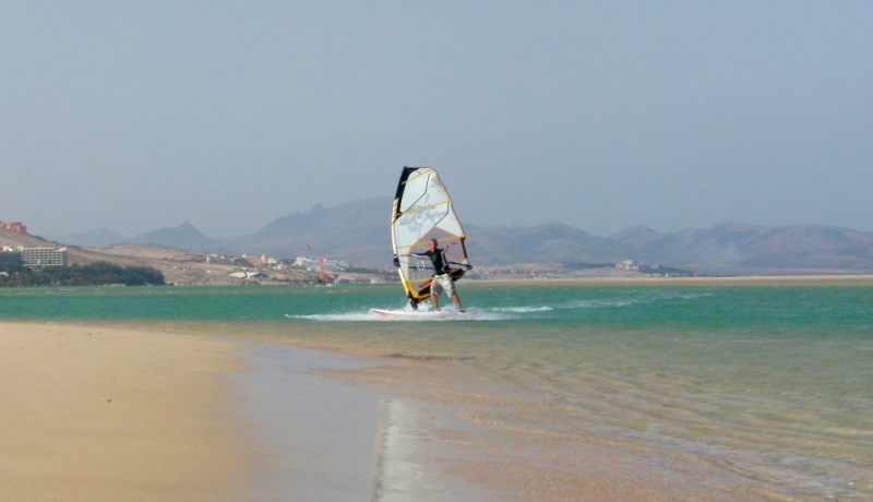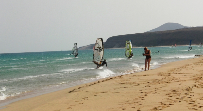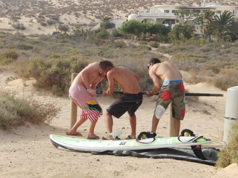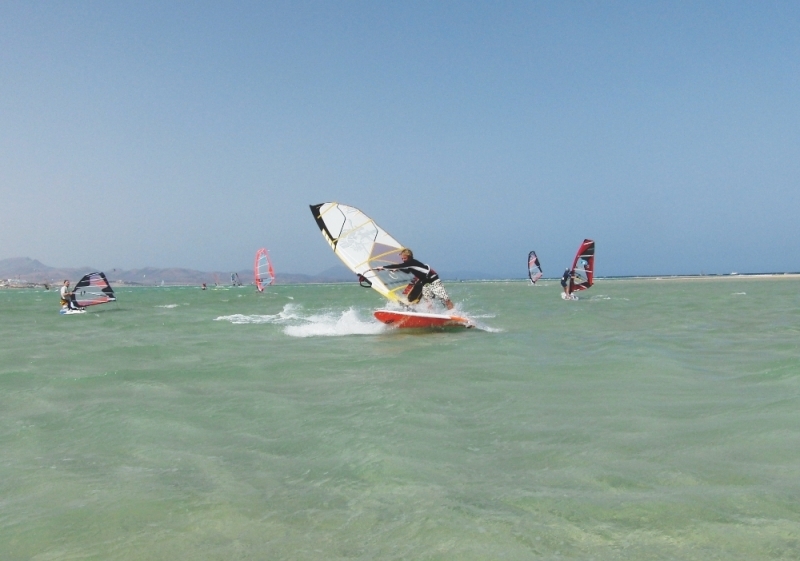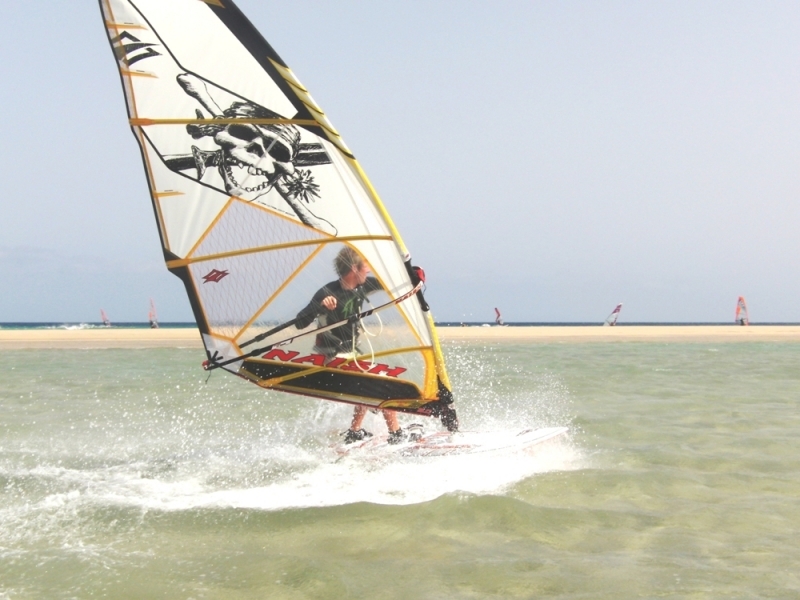 Windsurfing na Fuerte?? No jak bych to řekl,za celý měsíc nám nefoukalo asi třikrát.Jezdili jsme hodně na Sotavento což je hodina a čtvrt cesty . Na Sotáči jsou podmínky dost raketové,za celý pobyt jsem tam jen jednou vytáhl 5,0 a jednou nefoukalo vůbec,jinak pořád na 4,0 a 4,4 plachty (mám 80kg),většinou hodně ,hodně přeplachtíno. V těhlech podmínkách se nedalo nic moc extra naučit z frejstajlu ,natož pak něco fotit či točit(létajcí písek).Jezdili jsme u Rene Egli 2. Fouká tam víc a je tam hladší voda.V Rene Egli 1.je pořádný motocros a nás tam navíc čekal bombonek v podobě PWA ,super podívaná .co ty borci dokážou ,fakt nechápu.Jen občas jsme krapet nesouhlasili s rozhodčíma, Gollito sice vyhrál zaslouženě,ale nebyl zrovna sympatickej ,pro nás byl jednička Steven Van Brokenshit. Na jihu se také jezdí na pláži nad Costa Calmou ,super flat a vitr trochu slabší. Je fakt ,že takové bomby jako foukají na Sotáči jsem nikdy nezažil,ale je to super zážitek.