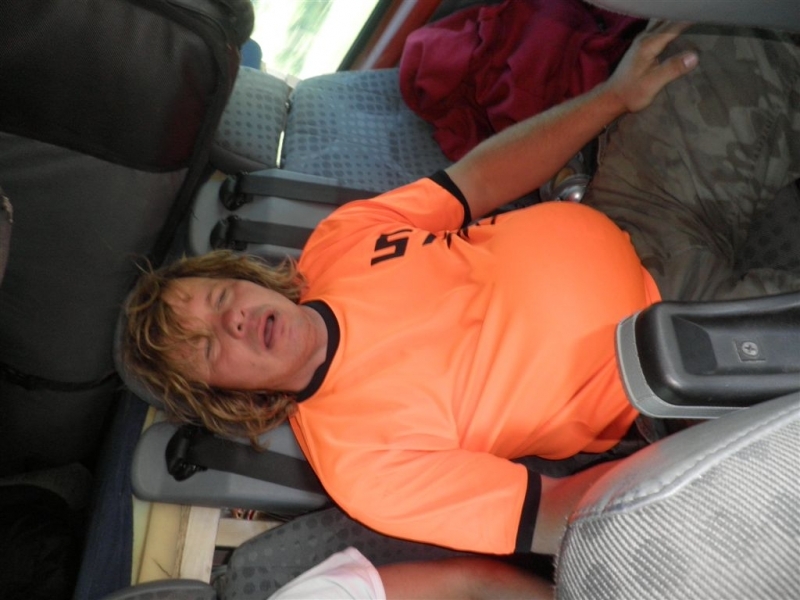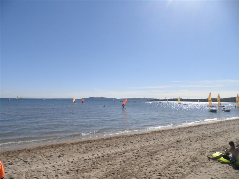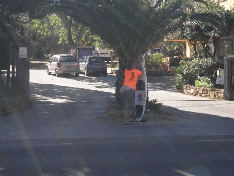 Den 1: nazacatku resim 4.2 nebo 5.2, jezdim 4.2 vetsinou OK obcas malo, kluci jezdi 5.3 , Pepik kajtuje. Vlny jsou blbi, spis nejsou, tak 50 cm, onshore, da si udelat skok ale zajezdis na ni 2 otacky a uz dostavas flosnou do pisku. Hodne blbcu jsou na vode, normalne jedes pravou rukou dopredu, jedou v protismeru rovne na te a tak skoro kazdy druhy, od jedneho kitera musel jsem brzdit nohama ve vode. Pepik kajtuje, ma oranzove triko takze kazdy ho vidi z dalky. Z lide slisim francouzu malo, vetsinou nemecky (svicary?) a par italove. Vecer smazene brambory z cibulkou a dalsima veci, zacinam ja pak to prebira Pepik, jo a topinky. Ten ale ma energie, je sliset jenom jeho, az tak ze nestaci casu na michani jidla. Vsechni jsou najezdeni nazrati, kempujeme v mobilhomu, Jarda ten komfort nesnasi a jde spat do auta.