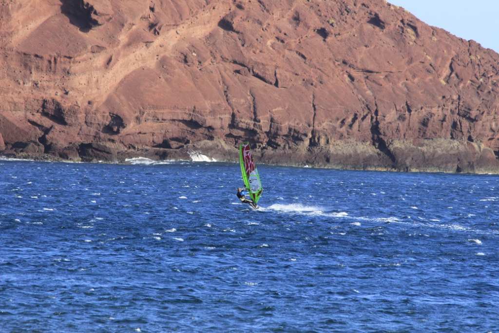 V půlce února dokonce nasněžilo na hoře El Teide. V těch dnech ale přišla taky Calima (teplé proudění s prachem ze Sahary) a tak o 60km dál v horách bylo až -12° Celsia, k tomu 2 metry sněhu a na pobřeží slunečno a 23° Celsia. Takže si jezdíš na vodě a koukáš na hory pokrytý sněhem.. hustej pohled..