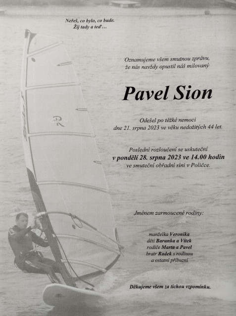 Kamarádi surfaři z Velkého Dářka, oznamuji vám, že se s kamarádem Pavlem na vodě už nesetkáme.